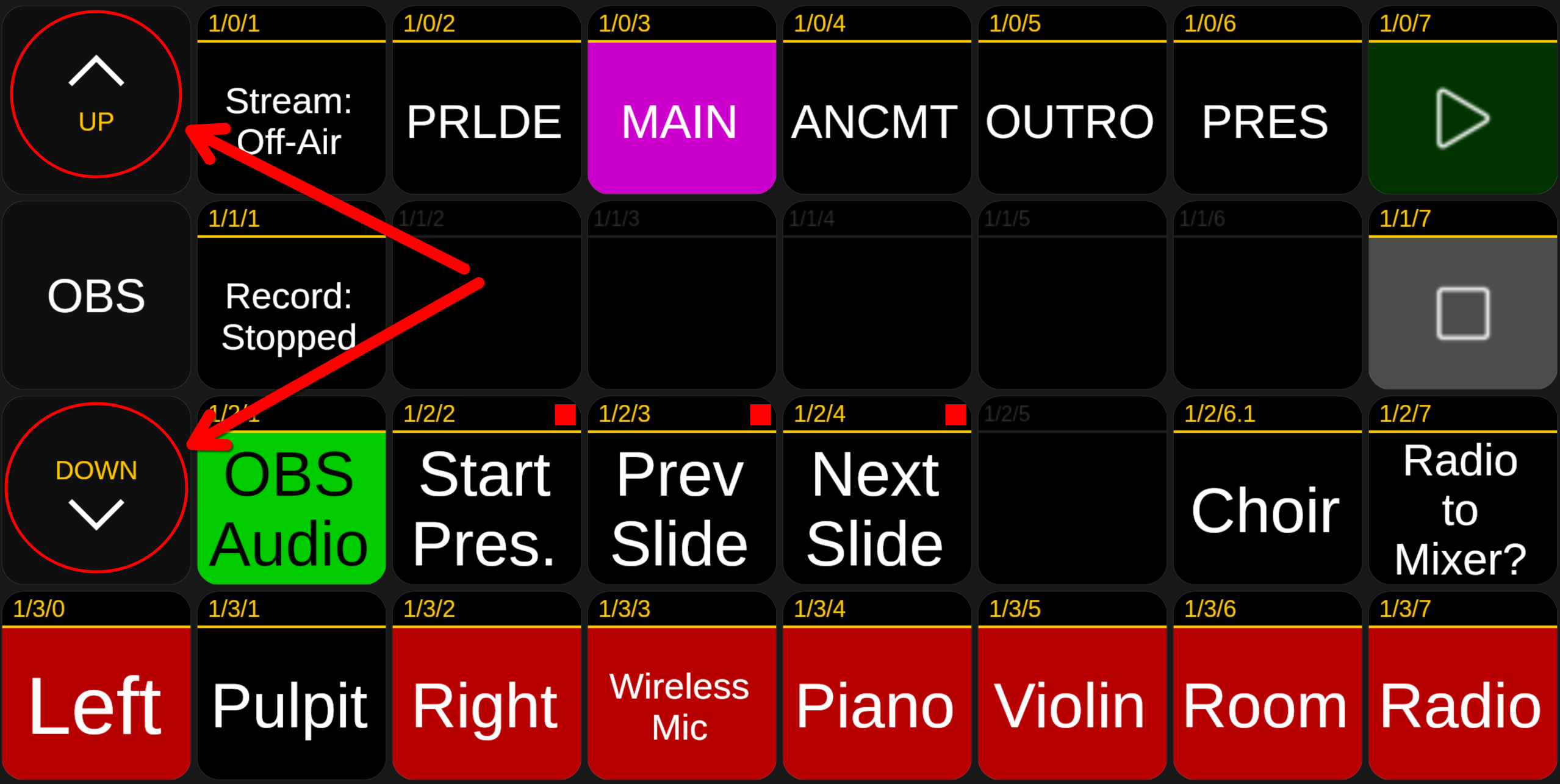 The background color of the button will change to indicate which scene is active. They additionally mute and unmute specific microphone channels so it is important that we use these buttons to change scenes and not the mouse within OBS.